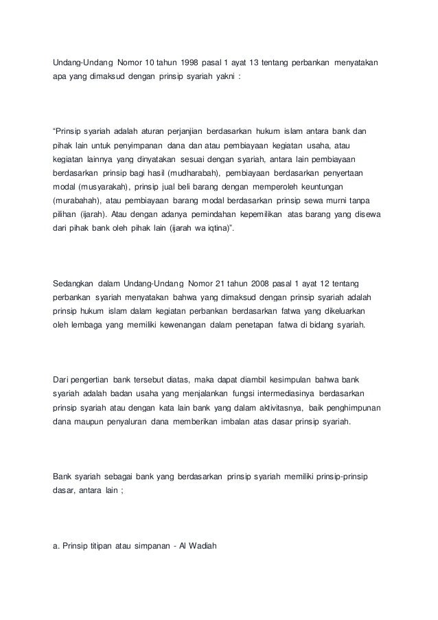 Bank syariah adalah lembaga keuangan (bank) yang menjalankan kegiatan usahanya berdasarkan prinsip syariah islam dan menurut jenisnya, bank syariah terdiri dari bank umum syariah dan bank pembiayaan syariah. Prinsip bank syariah yang sesuai dengan hukum islam diantaranya tidak adanya unsur ria, maisir, gharar, serta jual beli barang haram. (uu 21/2008) landasan hukum bank.