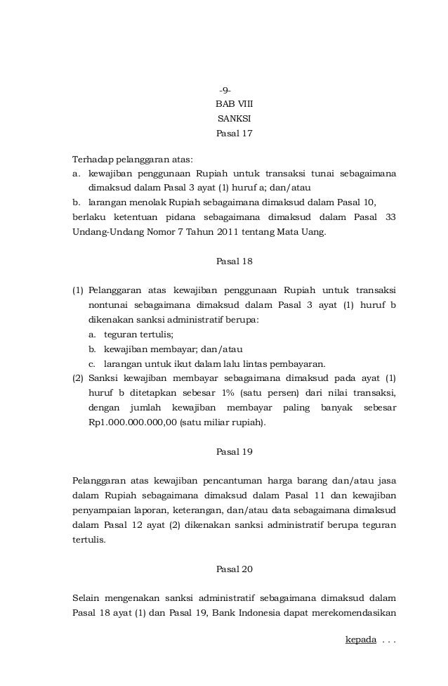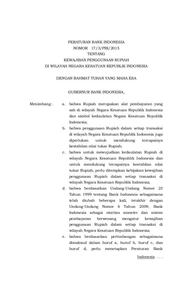 Peraturan bank indonesia nomor 17/3/pbi/2015 tentang kewajiban penggunaan rupiah di wilayah negara kesatuan republik indonesia dengan rahmat tuhan yang maha esa gubernur bank indonesia, menimbang : Peraturan bank indonesia (pbi) ini merupakan peraturan bank indonesia nomor 16/13/pbi/2014 tentang pengeluaran dan pengedaran uang rupiah … 11 agustus 2015 … size: Gubernur bank indonesia, menimbang :