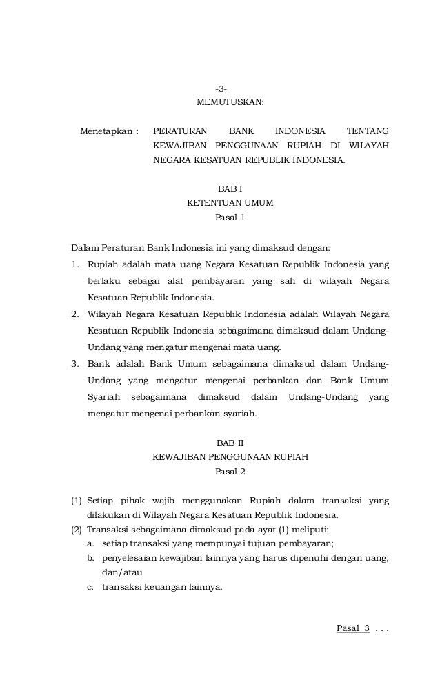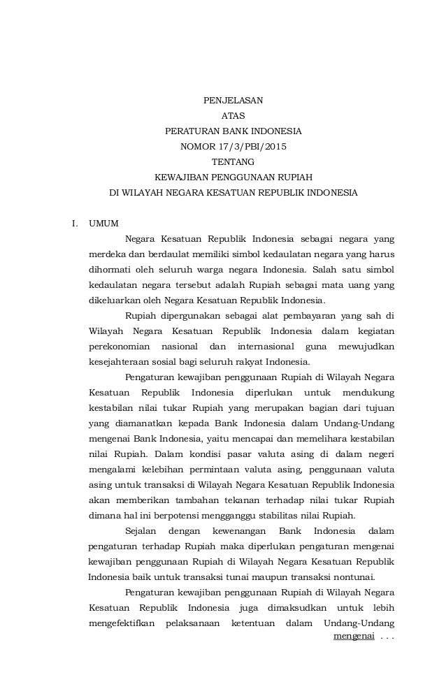 Peraturan bank indonesia nomor 17/3/pbi/2015 tentang kewajiban penggunaan rupiah di wilayah negara kesatuan republik indonesia dengan rahmat tuhan yang maha esa gubernur bank indonesia, menimbang : Peraturan bank indonesia nomor 17/3/pbi/2015 tahun 2015 tentang kewajiban penggunaan rupiah di wilayah negara kesatuan republik indonesia Dan masih ada beberapa hal lagi mengenai peraturan bank indonesia nomor 17/3/pbi/2015 seputar pengecualian dan ketentuannya, yang bisa diketahui masyarakat dan stakeholder terkait.