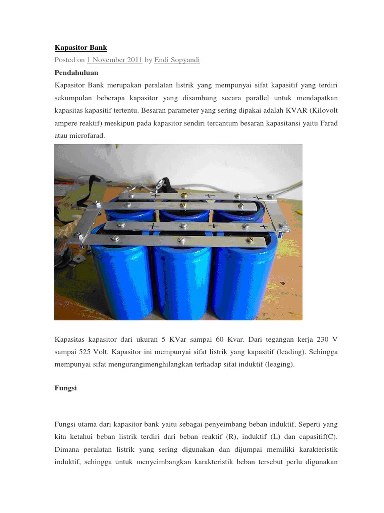 Penggunaan kapasitor bank salah satu fungsinya adalah sebagai alat untuk meningkatkan factor daya. Hariansyah1, joni setiawan2 1dosen tetap program studi teknik elektro fakultas teknik universitas ibn khaldun bogor, jl. Kapasitor bank berfungsi dalam mengkompensasi daya reaktif dan memastikan tegangan terjaga pada levelnya pada saat beban penuh.